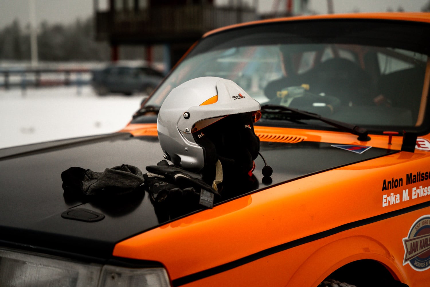Utanför klubblokalen står Antons orangea rallybil, en gammal Volvo 242 som han själv byggt, och lyser extra starkt mot den vita snön. Om bara några veckor ska den rulla igen och det är ingen liten sak. Anton och dottern Erika Eriksson, kartläsare, ska nämligen tävla tillsammans i Historic-klassen under Rally Sweden, för femte året i rad.